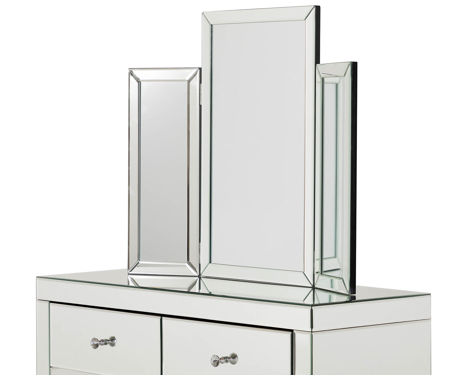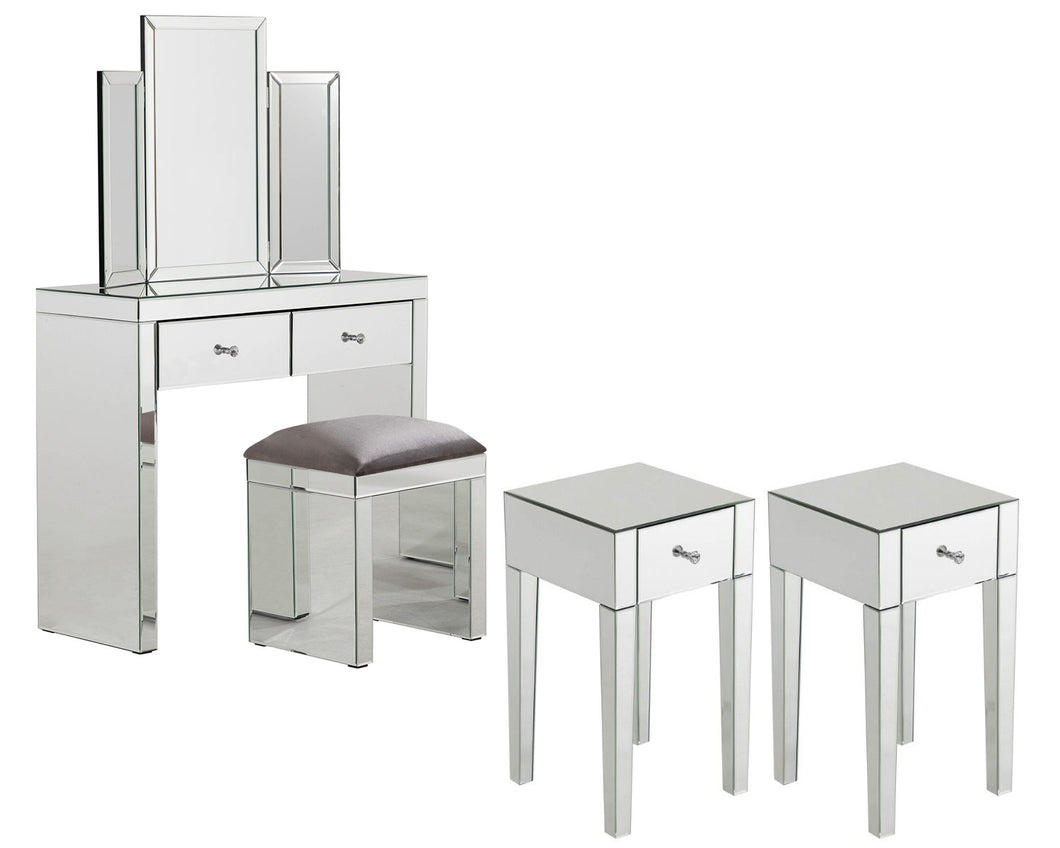 Monroe Silver Mirrored Console Table Set with 2 x 1 Drawer Bedside Tables, Stool and Tri-fold Mirror