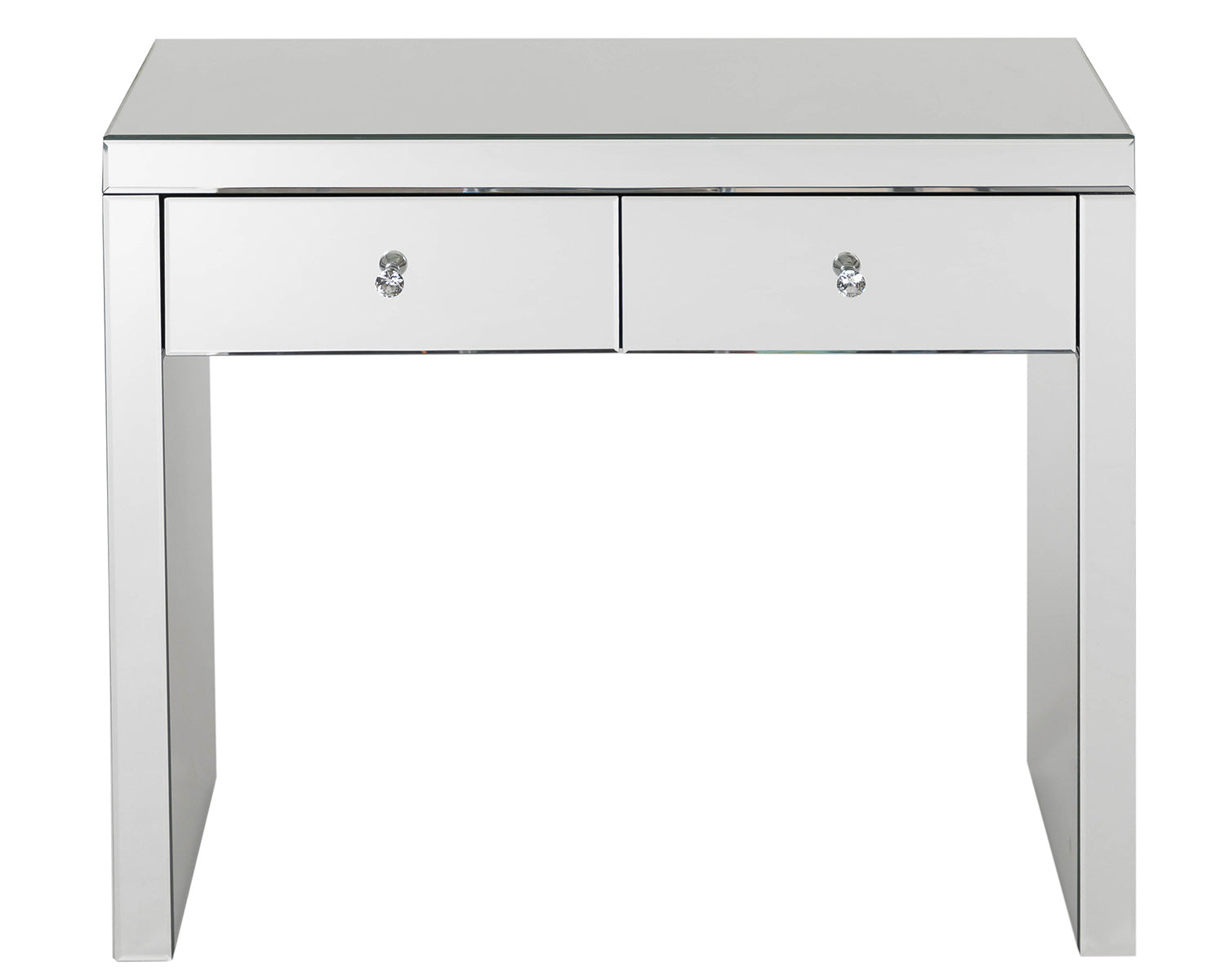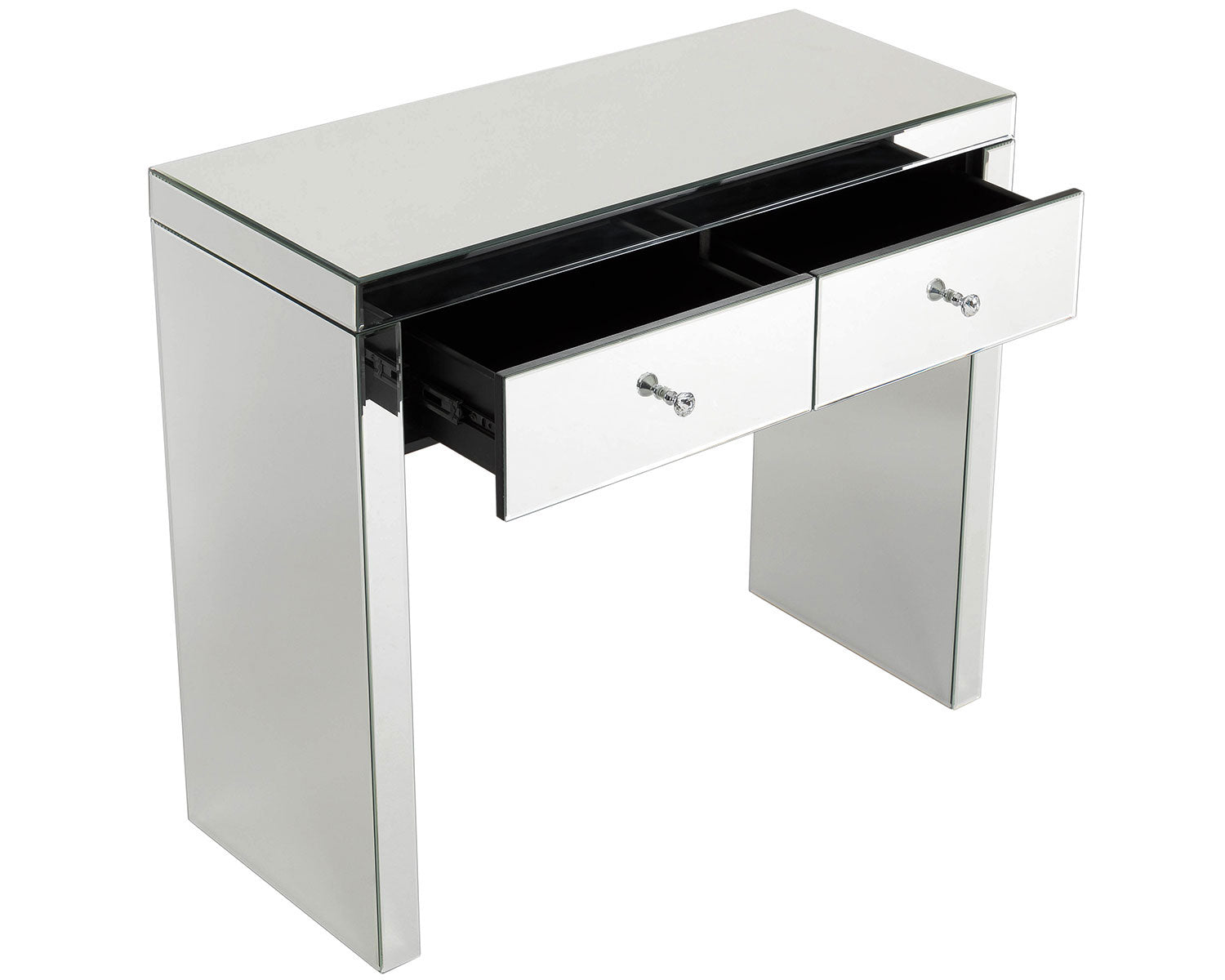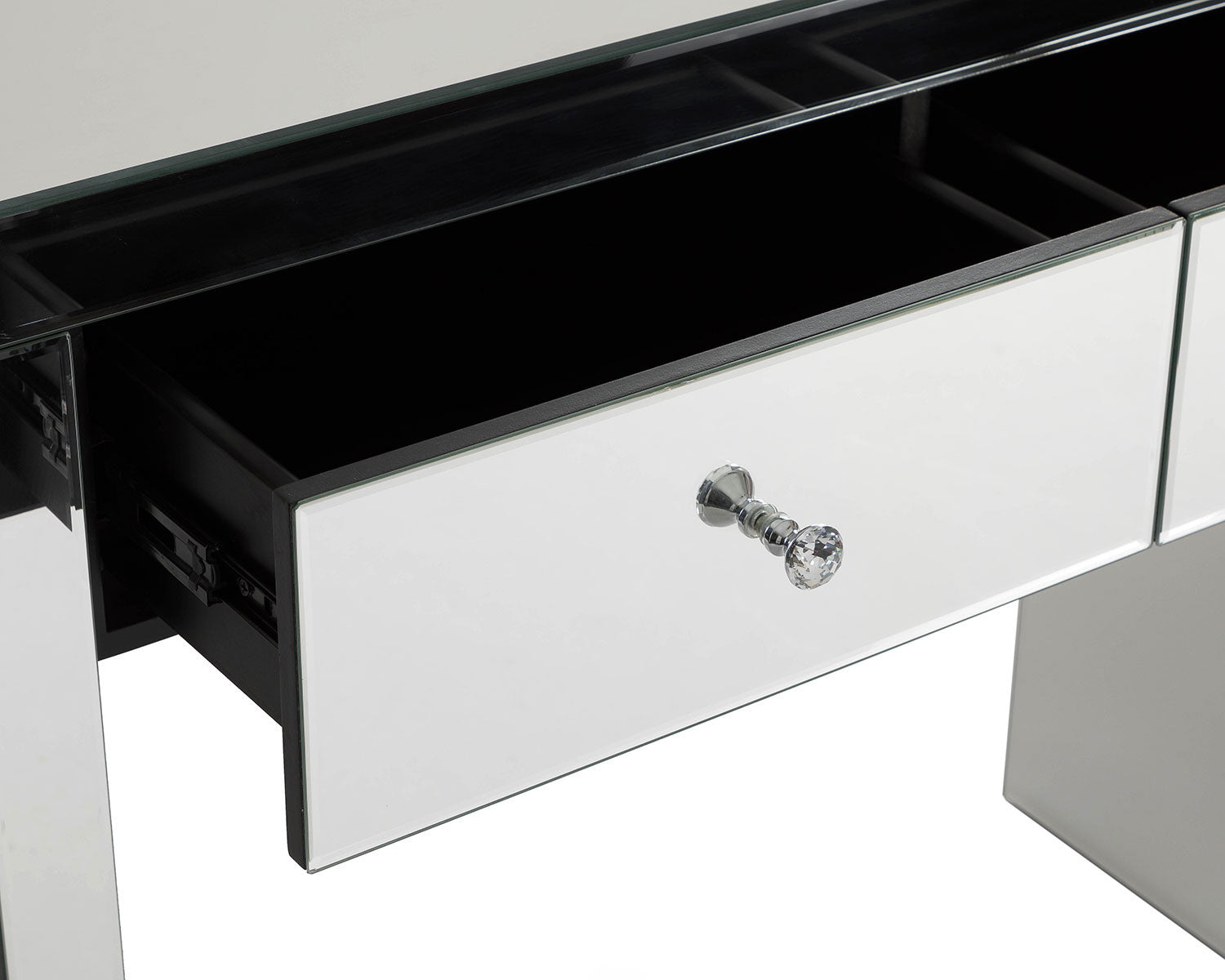 Impress your guests with the Monroe console table set. This set comes with a chic mirrored finish, whilst two crystal glass handles develop a luxury look. The tri-fold mirror would look great on any dressing table, but it matches perfectly with our console table. The adjustable design means you can set this mirror whichever angle you require. The mirrored stool has a grey velvet cushioned seat, which is incredibly comfortable. The two single drawer bedside tables will brighten up the corners of your room.