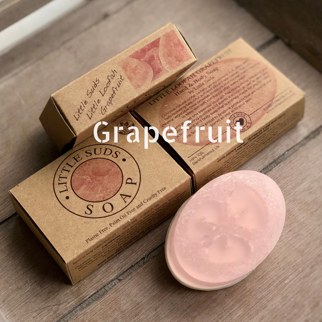 Little Loofah Grapefruit Soap – This beautiful exfoliating soap contains a slice of natural loofah gourd to help gently remove dull, dead skin cells revealing beautifully soft & vibrant skin below.