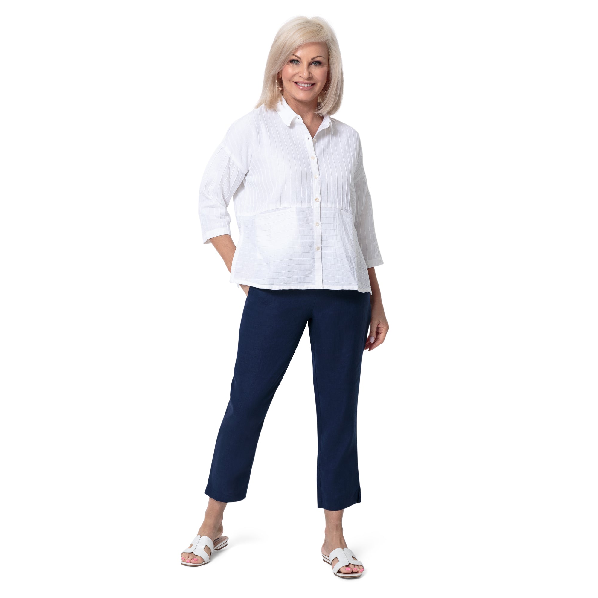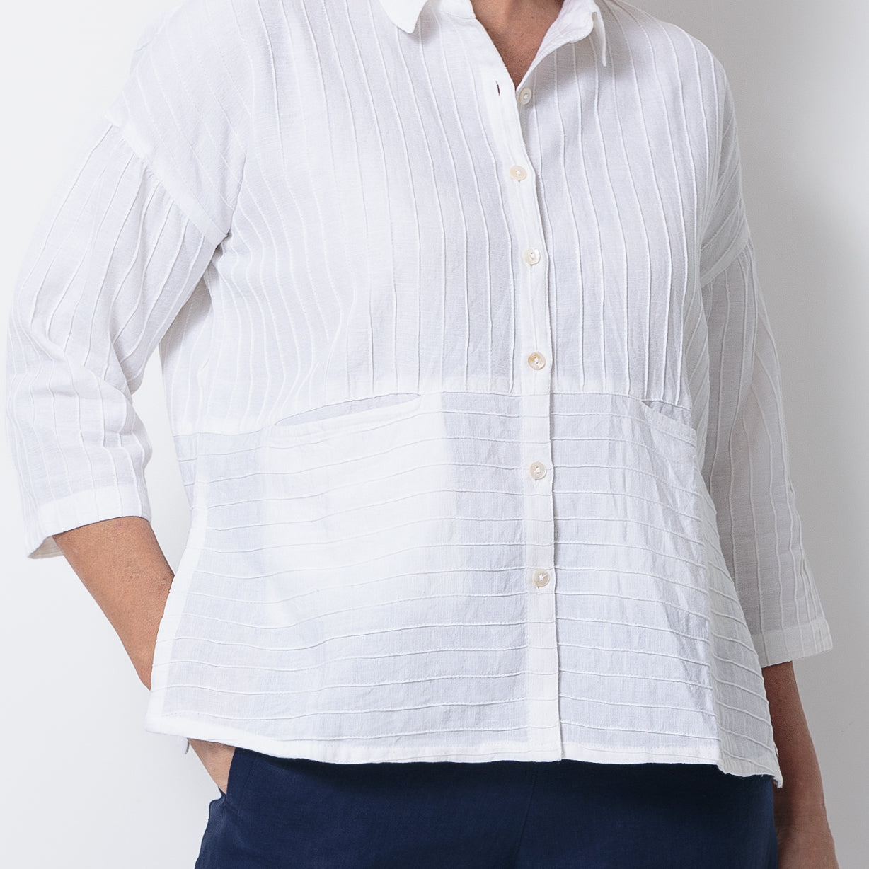 Our pintuck shirt/jacket with pockets. A perfect summer top, button through with sleeves. Layer over a dress or top, or simply as a button up top. Info and Care: 58% Viscose, 28% Cotton, 14% Linen Machine Washable Length: 60cms Loose Fit