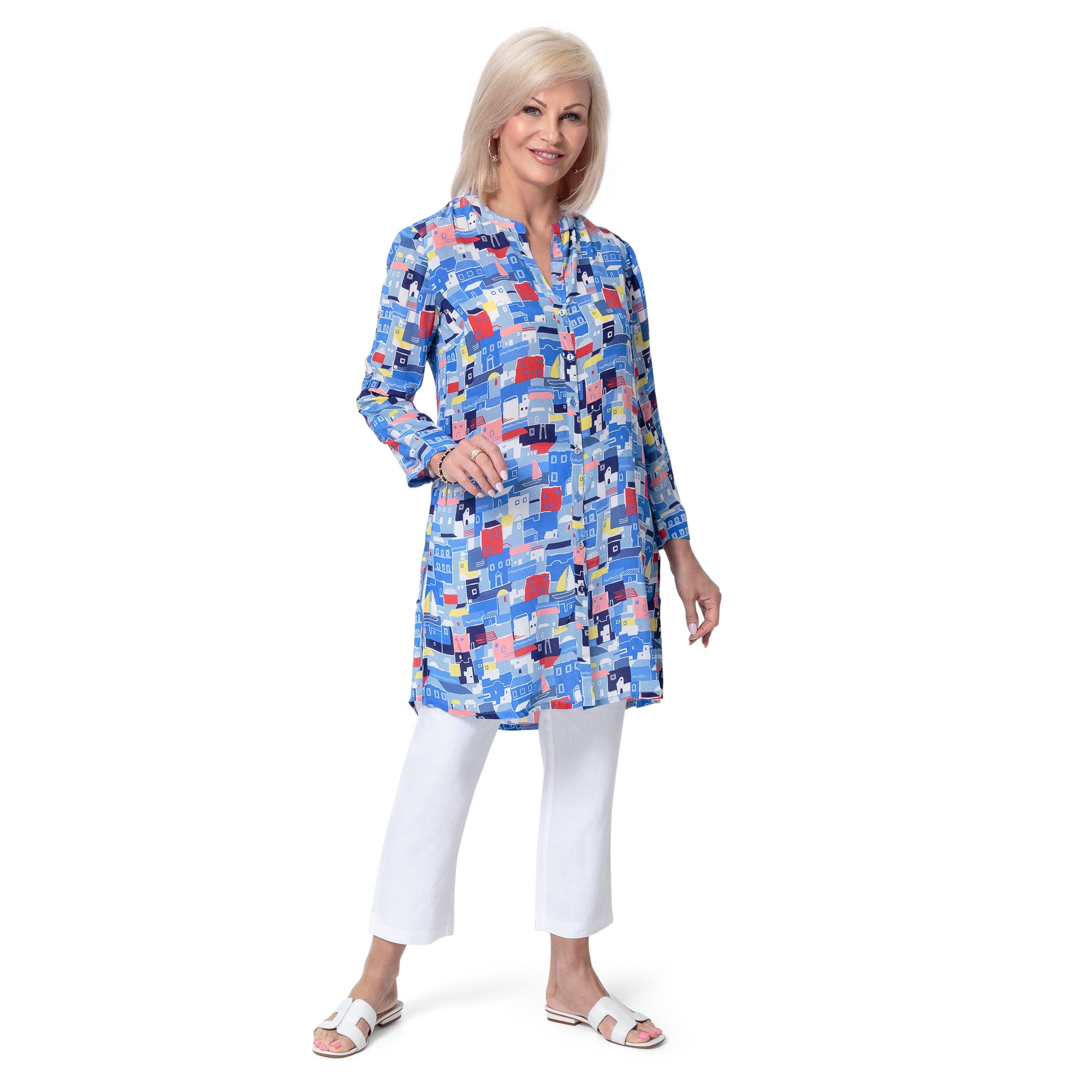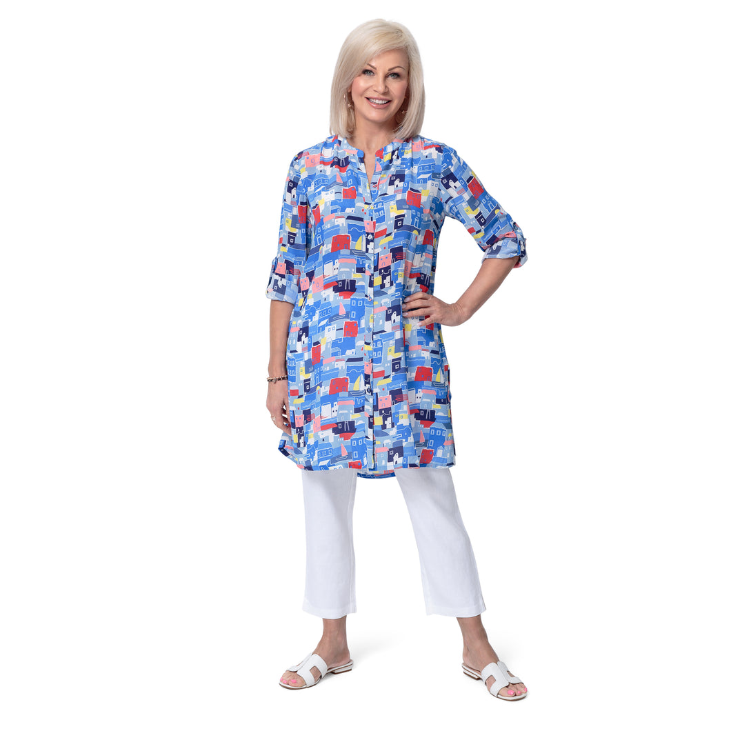 Our 100% silk Mykonos print button through shirt/tunic. A stunning summer long shirt with a glorious print evoking sun drenched Mediterranean houses. Perfect to wear buttoned up as a knee length dress, or open over a t-shirt and trousers.Info and Care: 100% Silk Machine Washable Length: 90cms Loose Fit