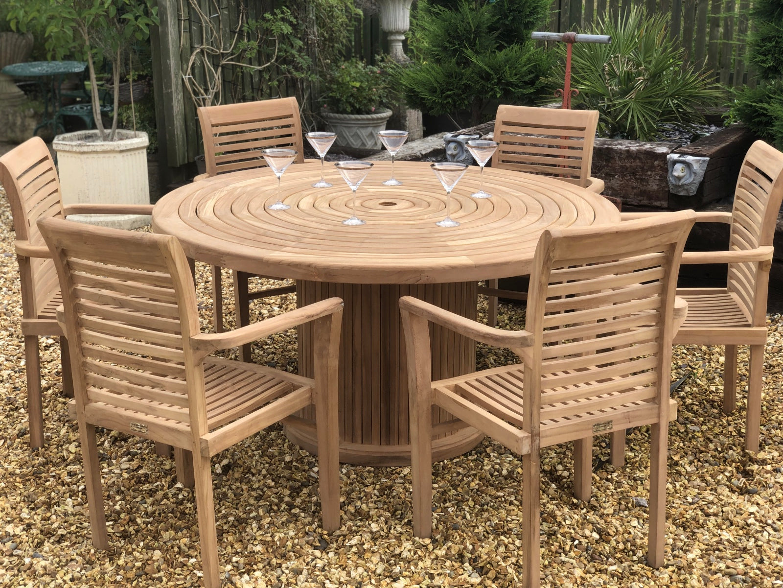 Teak Round table 150cm with 6 teak stacking chairs