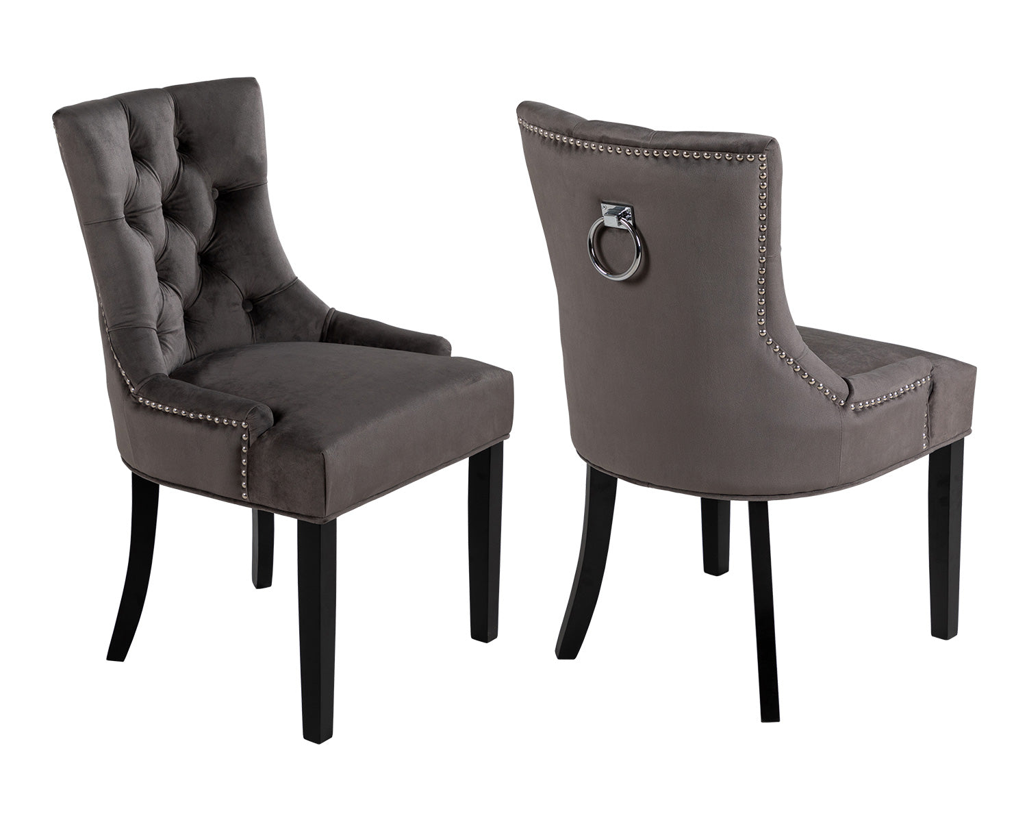 Add luxury chairs to your home with this pair of Verona dining chairs in upholstered grey velvet. Chrome studs and knocker caress the back showing off its decedent design features. Plumped cushion and back rest create an extra comfy seat. The oak black finish legs have a protective rubber sole, so scratches won’t appear on your hard surfaces. If these chairs are for your dining area, or as a feature in your living room, it will certainly get the attention it deserves.