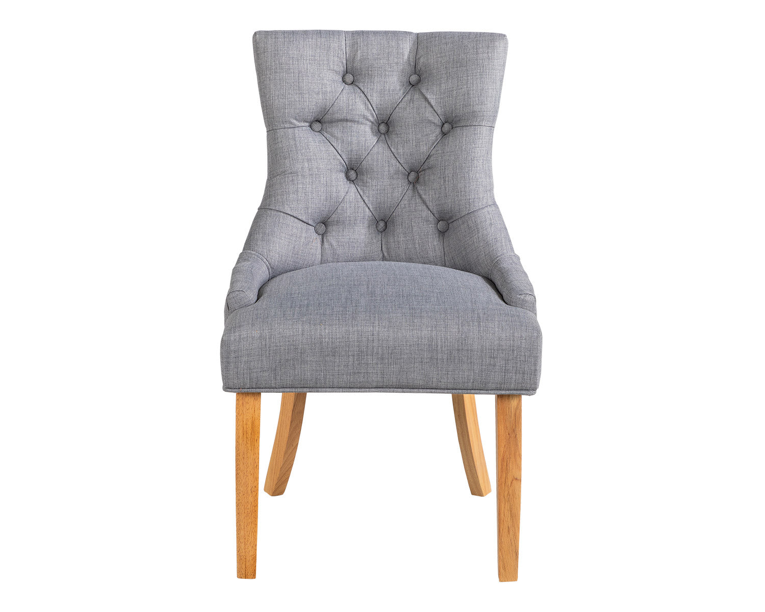 The Verona dining chair is extremely elegant and adds an extra level of style to any room in your home. Curved for comfort, these Verona dining chairs have padded, linen feel upholstery. Chrome studs align the outside of the chair whilst a stunning chrome knocker handle cradles the back. The grey is on trend and is a popular colourway with modern homeowners. The chair feels firm, comfortable, and is ideal to sit on for a long period. The curved backrest and low snub arms will support your body just perfectly. The oak legs finish off the styling of this chic chair. Protective rubber pads guarantee that scratches and scuffs won’t harm your hard flooring.