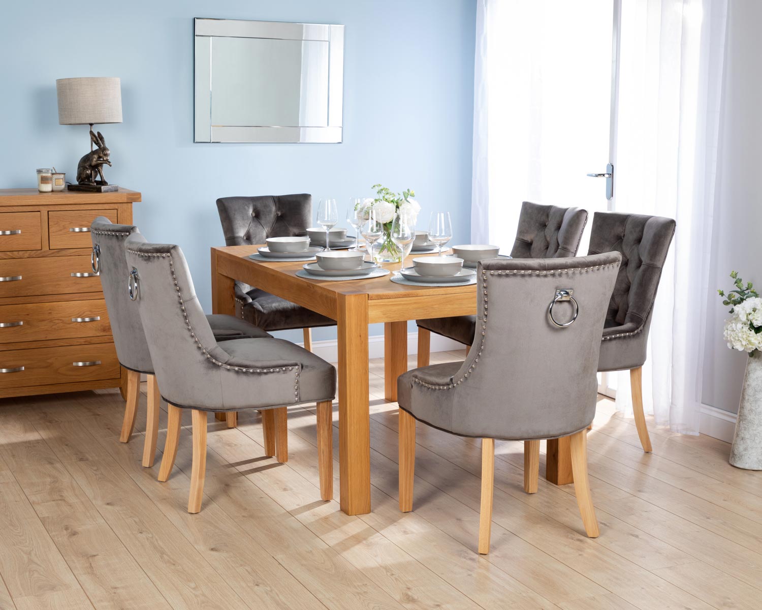 Rectangular Oak Dining Table and 6 Grey Velvet Verona Dining Chairs with Chrome Knocker and Oak Legs