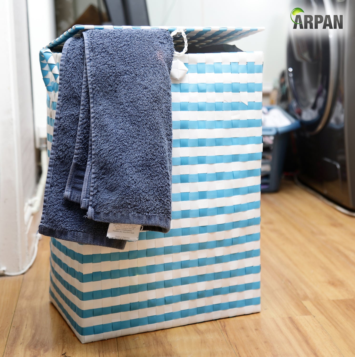 POLYPROPYLENE WHITE BLUE LAUNDRY BASKET: Made from soft polypropylene material on a strong metal frame makes it sturdy. hand woven and compact style with breathable ventilation across weaving strips.