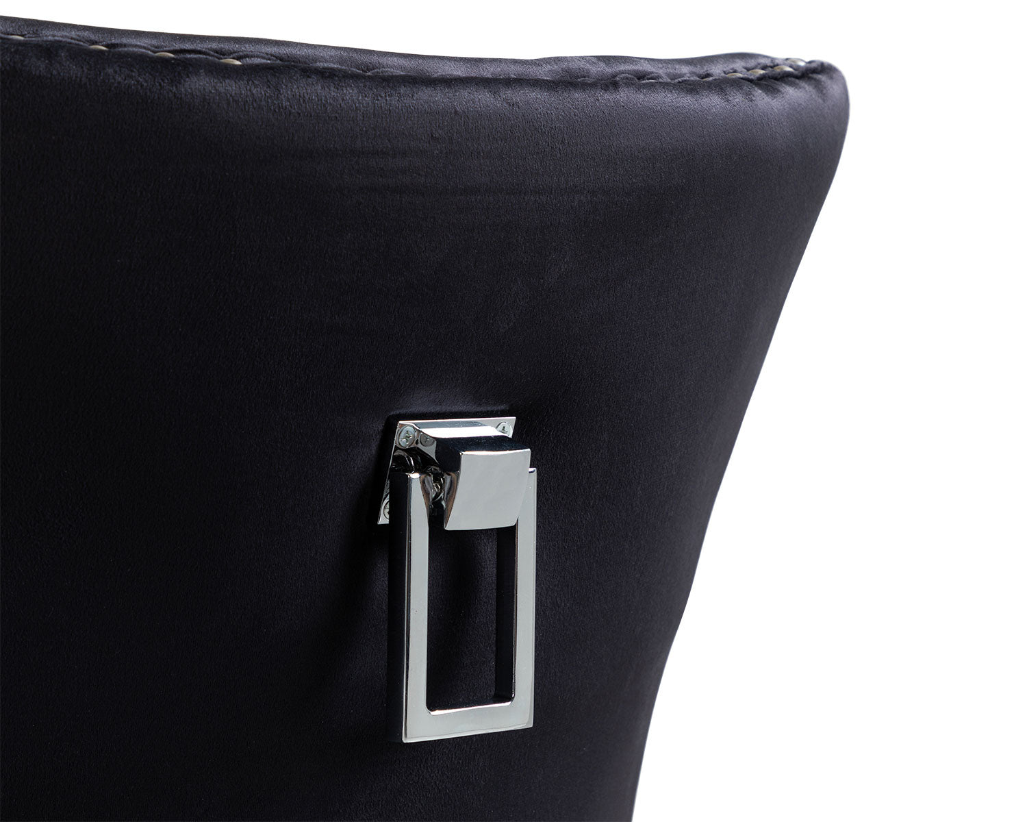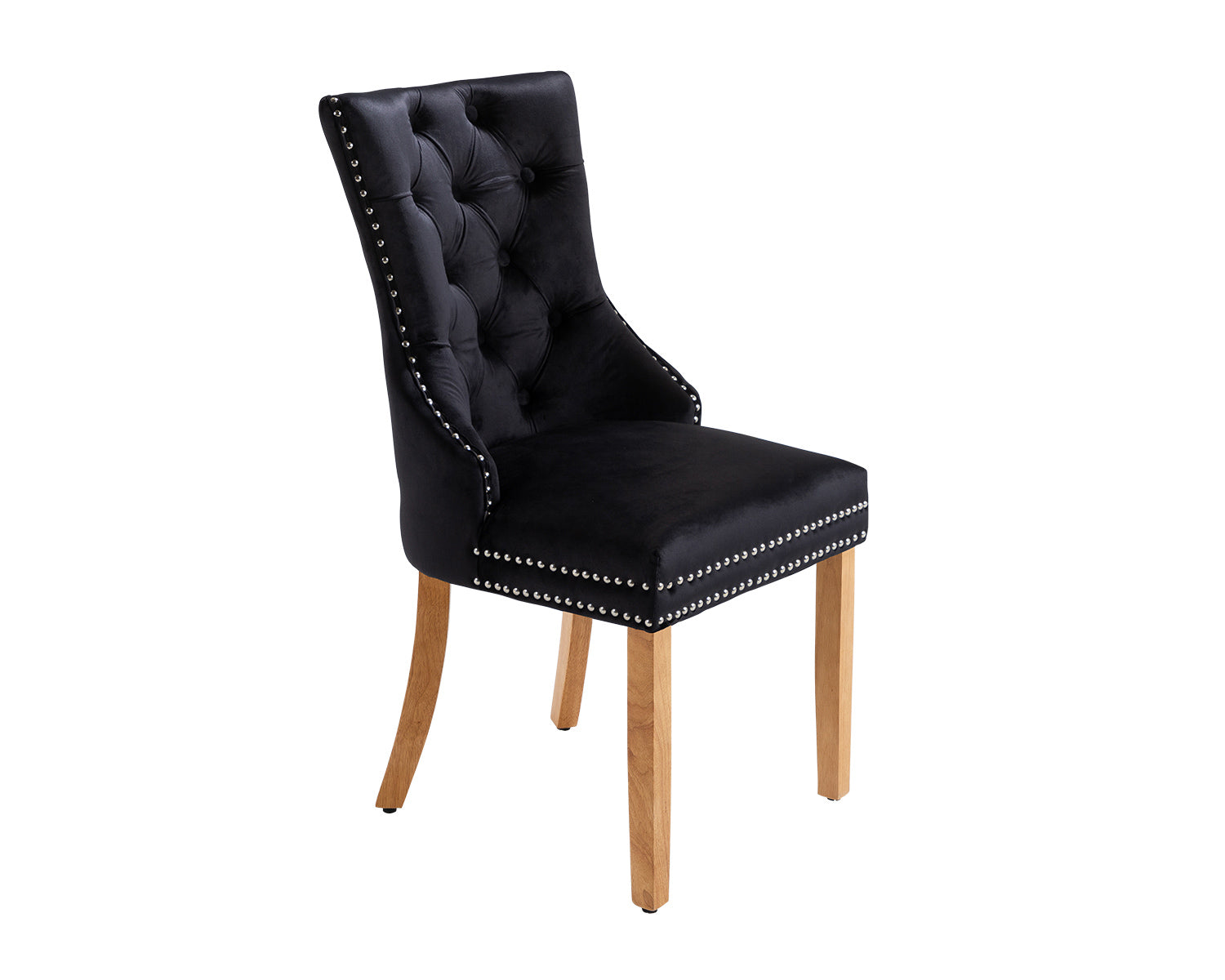 Enhance the look of your home with our Ashford dining chair in black velvet. Classic meets ultra-modern as the button backrest has chrome studs decoratively placed around the edges of the chair. The back of the chair features a chrome knocker, that ensures this chair is one that’ll stand out form all angles. Sit back on the densely cushioned seat and feel the luxuriously soft velvet upholstery, which has been coated in Teflon fabric protector that will prevent spillages from causing lasting damage. The oak legs bring a simple yet stylish finish and with a protective pad sitting beneath each leg your hard surfaces won’t get scratched.