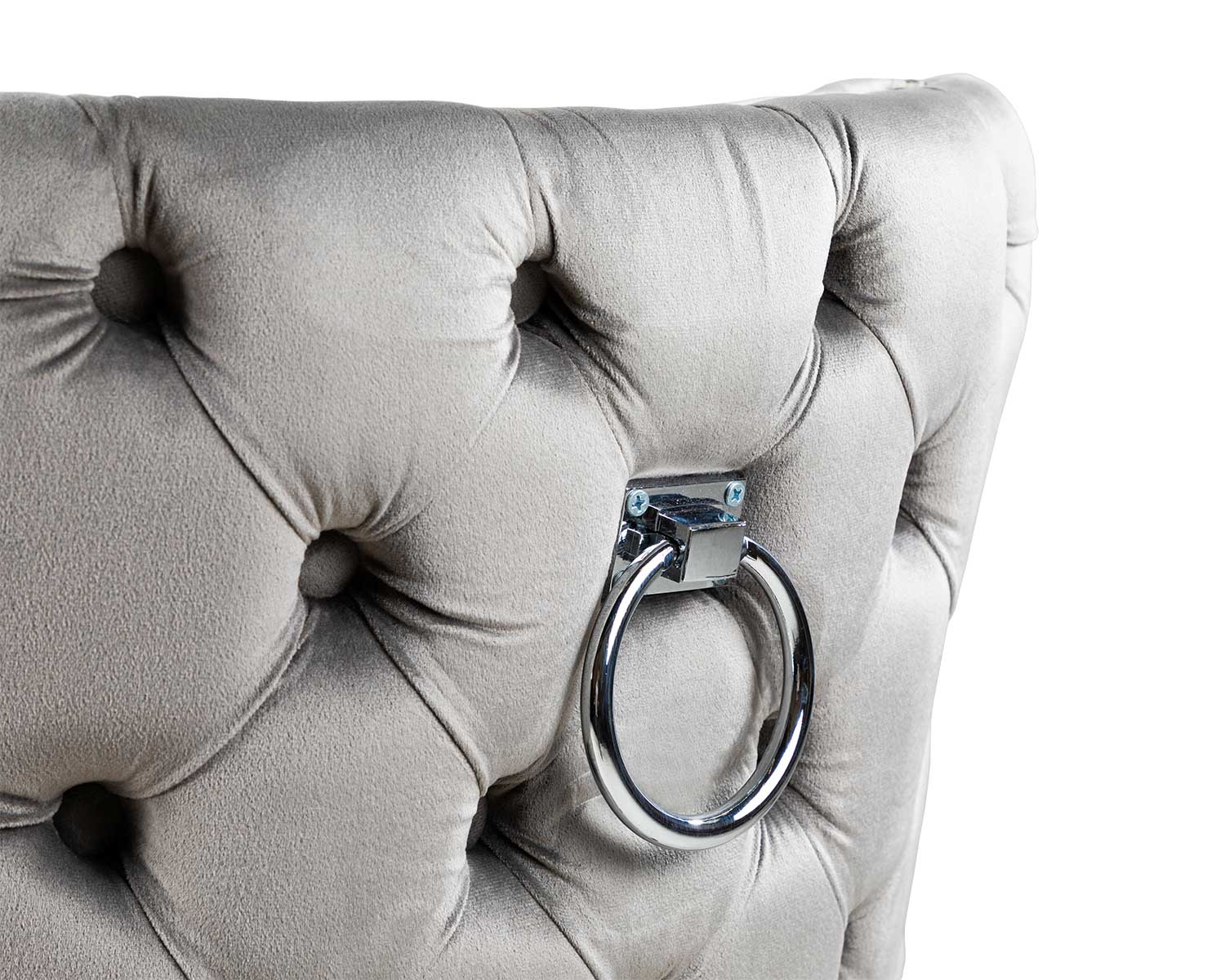 The Elizabeth range is designed to enhance your interior. A bold look that isn’t for the faint hearted, if you want to make a statement, then this chair will do just that. Looking front on this chair is simple, with chrome detailing. While the back offers the chairs uniqueness. Hand stitched buttons give the back a feature you’ll love. A large chrome knocker completes this ranges must-have look.Grey upholstery covers this chair, a neutral tone that is in keeping with modern trends. Bringing a sense of elegance the ultra-soft upholstery ensures you’ll be able to sit here for hours. A stylish and comfortable chair, what’s not to love?