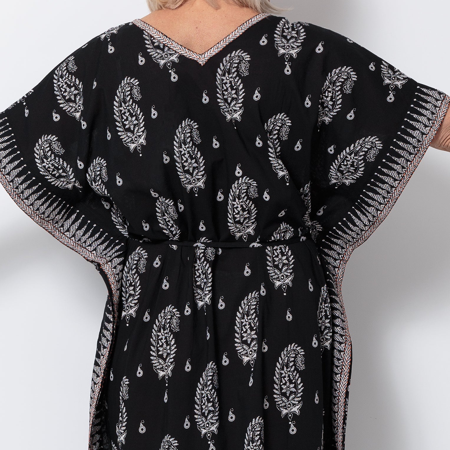 Our full length kaftan dress in black ground cotton with dramatic white paisley jacquard design. Wear with or without the tie belt. Can be worn as a dress on an elegant summer evening, or as a cover up. Info and Care: 100% Cotton Machine Washable Length: 138cms Loose Fit
