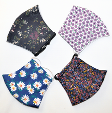 Fabric floral pattern face masks. These high quality masks are washable and reusable. They are made from fabrics that experts have advised can help protect from both spreading and contracting airborne viruses including influenza and Covid 19.