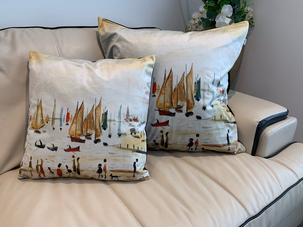 Cushion cover 45 x 45cm printed from the original artwork by the famous artist L S Lowry. Yachts is a light coloured and upbeat Lowry Print originally painted in 1959. The “ matchstick” man painter was born in Salford, Manchester in 1887 and was influenced by all the industrial buildings situated around Manchester,
