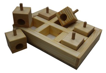 Six blocks to be lifted out of the frame, when high enough the treat will roll out of the angled hole inside. Use with solid biscuits or kibble.