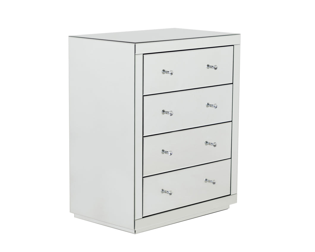 Let your room shine with the Monroe 4 Drawer Chest in Silver. If you’re a stylish home owner, who wants to add a bit of sparkle to your home, then the mirrored chest of drawers will be the perfect addition. Each handle has a stunning crystal glass knob, that oozes sophistication. The mirrored glass has a bevelled edge finish. Our chest of drawers is ideal to store clothes in to keep your home clutter-free.