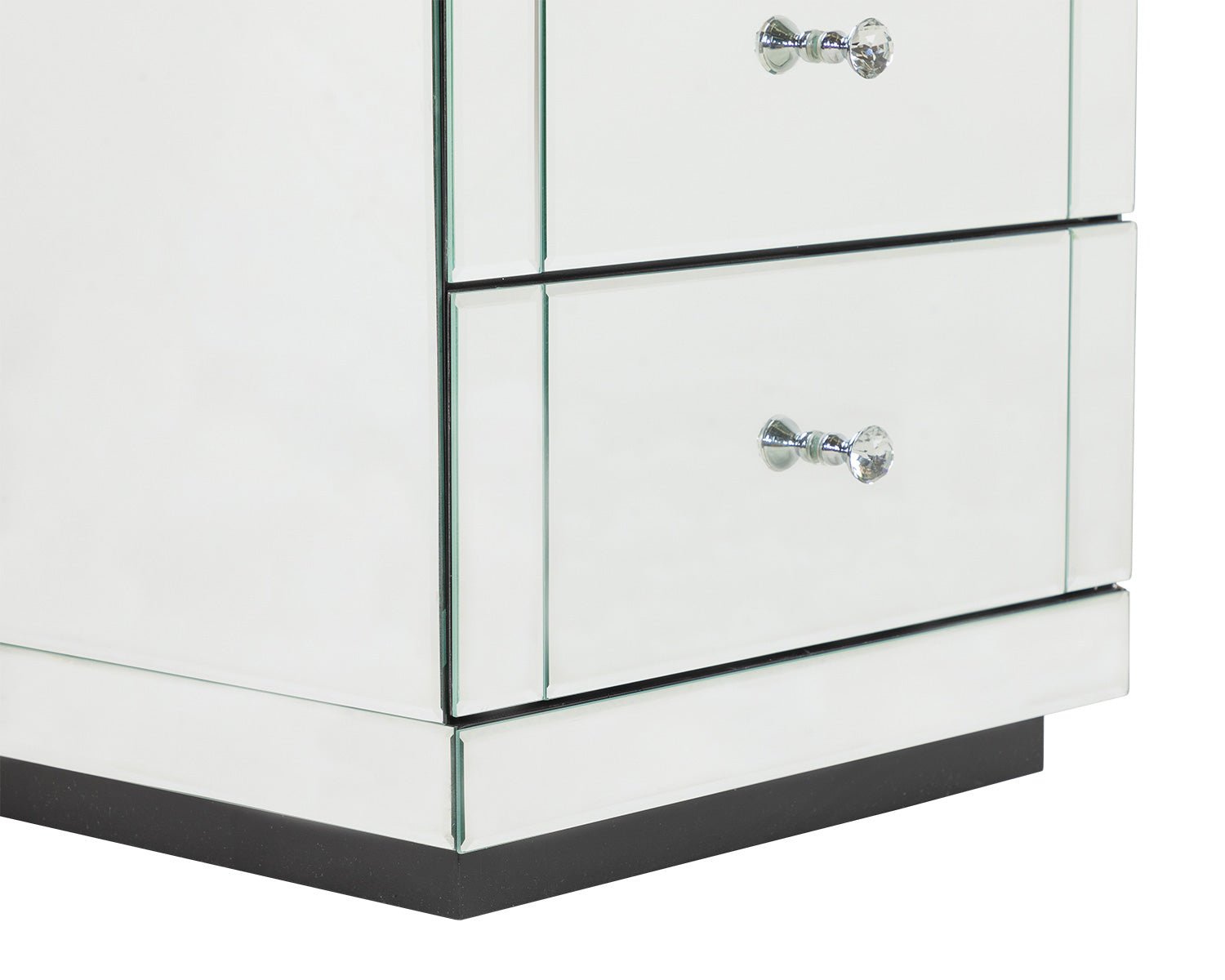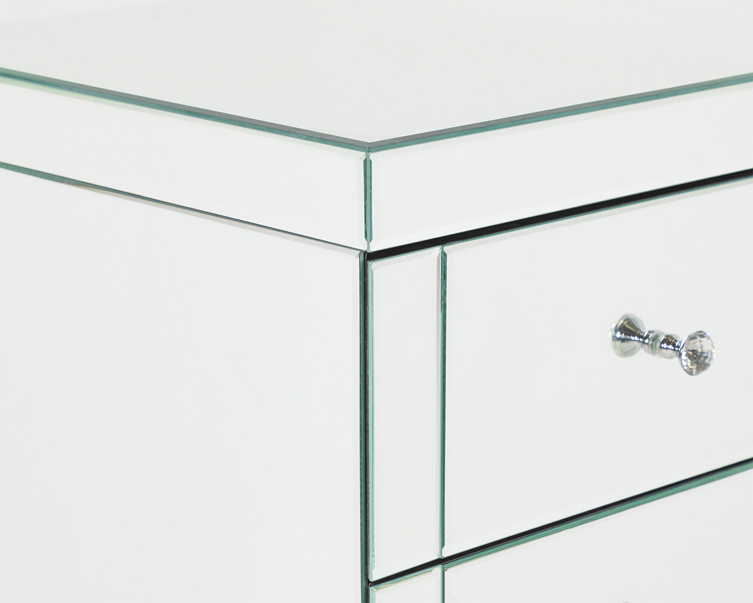 The Monroe range is a classic design with a reflective finish, and one you simply must get your hands on. The mirrored look is a bold statement for your home and looks perfect in the bedroom creating the illusion of space, which is needed, should it be lacking. Crystal glass handles finish off the stylish look of this set, with ample amounts of room allowing you to hideaway any bits and bobs. Ideal for a bedroom this mirrored five-drawer tall cabinet is perfect to store clothes in. With five spacious drawers you’ll have ample amounts of storage space to ensure you can keep your belongings hidden away for a clean finish in your bedroom. The mirrored unit is finished with bevelled edge glass for a classy finish.