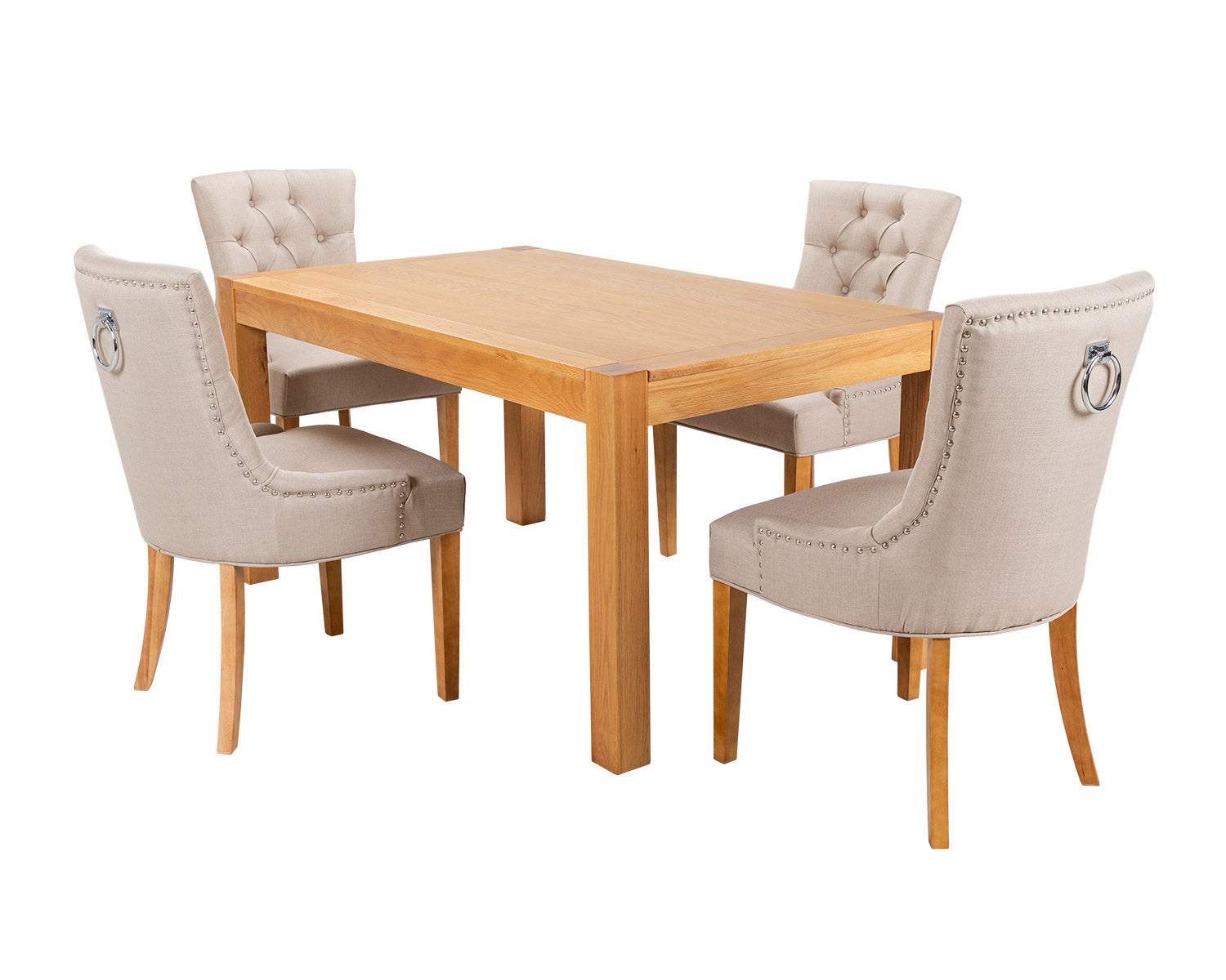 Rectangular Oak Dining Table and 4 Cream Linen Verona Dining Chairs with Chrome Knocker and Oak Legs