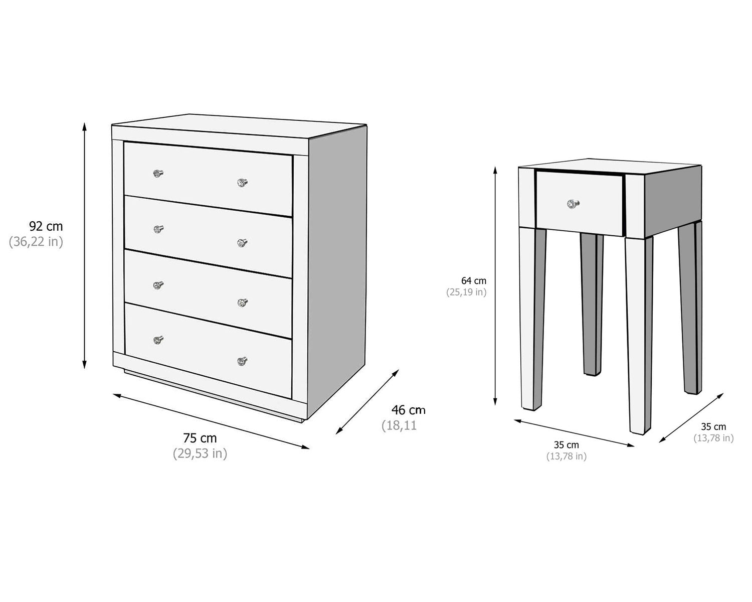 Whether you use this set exclusively in your bedroom or place the items around your home the Monroe mirrored furniture set will certainly impress your guests. This set includes the Monroe dressing table, with two drawers, each with a stunning crystal glass handle. The chest of drawers will shine in the light of your bedroom and has four drawers, so there’s plenty of room for storage. Two single drawer bedside tables bring additional place to hideaway those unwanted items to keep your home clutter-free, a stylish storage solution.