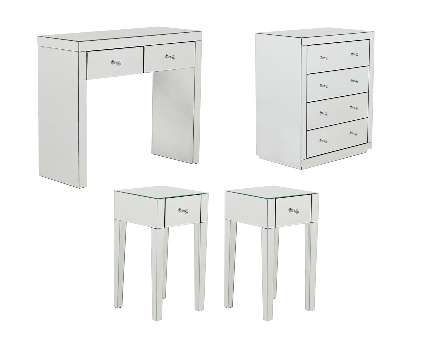 Monroe Silver Mirrored Console Table Set with 2 x 1 Drawer Bedside Tables and 4 Drawer Chest