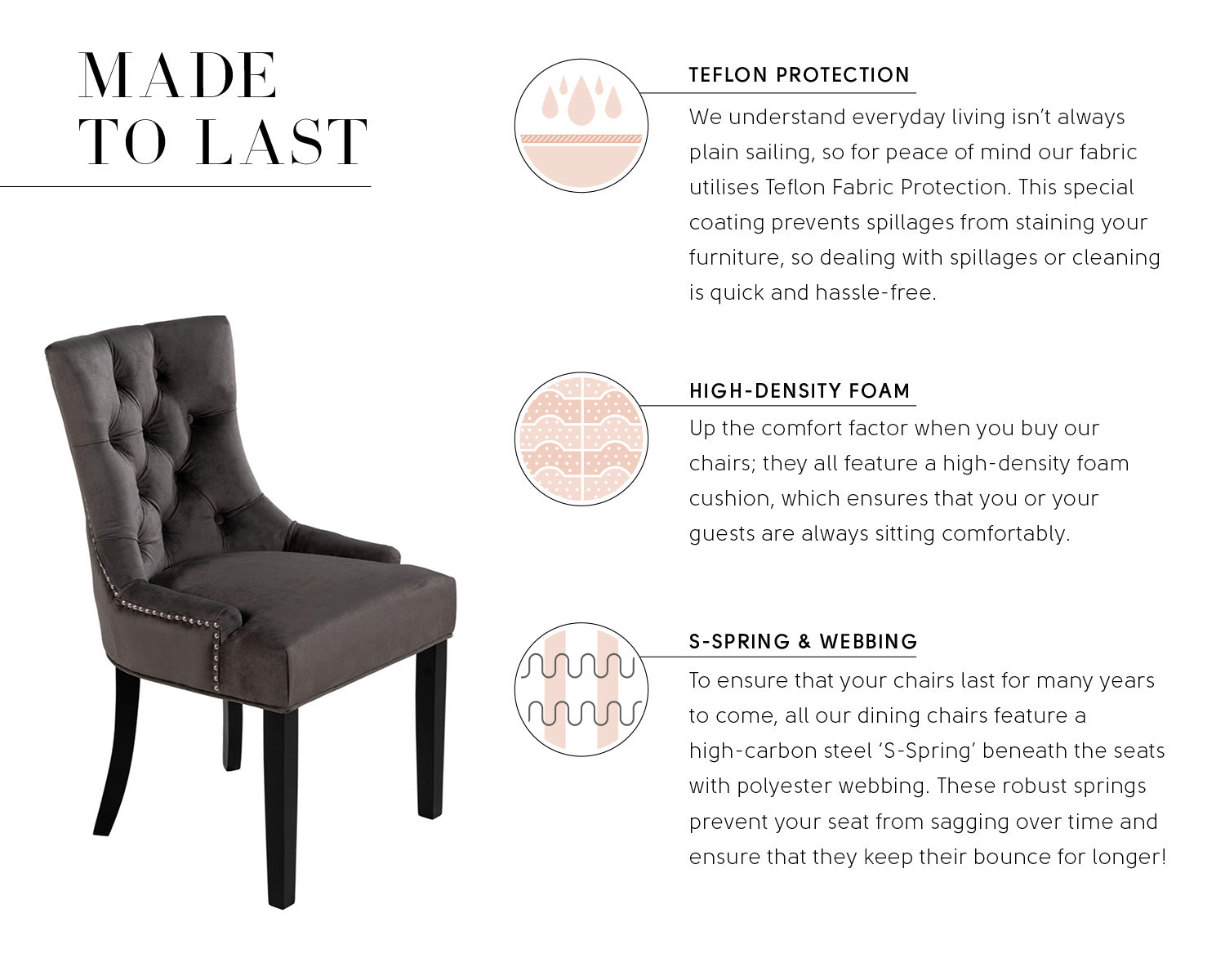 Add a luxury chair to your home with the Verona dining chair in upholstered grey velvet. Chrome studs and knocker caress the back showing off its decadent design features. Plumped cushion and back rest create an extra comfy seat. The oak black finish legs have a protective rubber sole, so scratches won’t appear on your hard surfaces. If this chair is for your dining area, or as a feature in your living room, it will certainly get the attention it deserves.